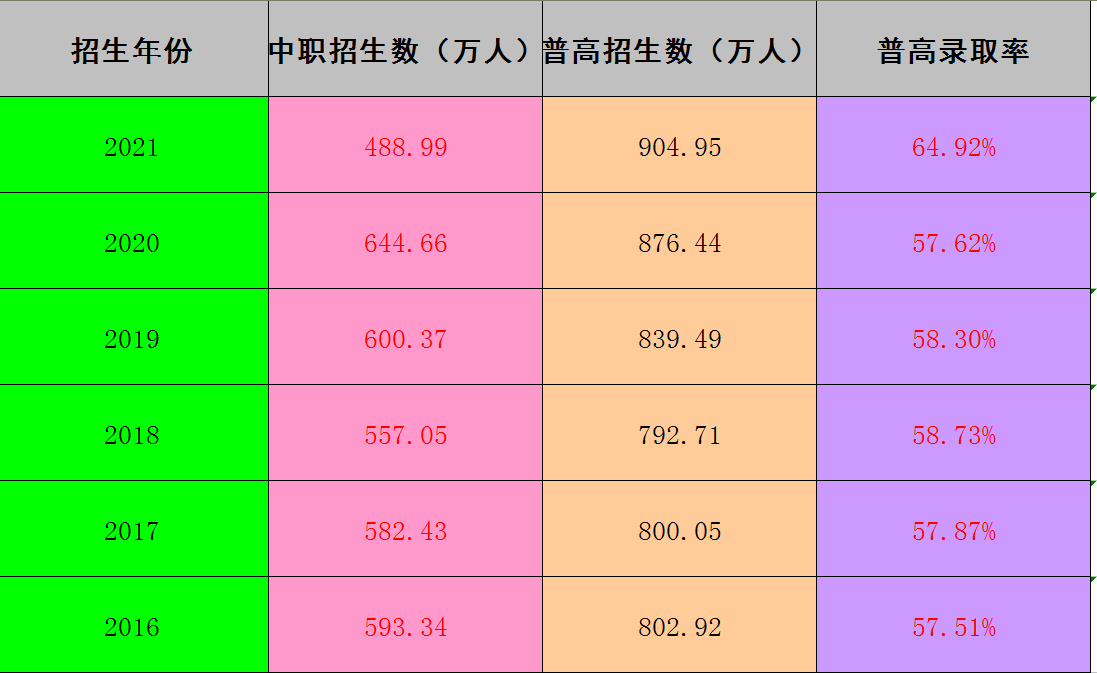对于家长来说,学生只要进入到职高,未来就没有发展的前景。状元教育团队通过统计,这两年我国在中考的时候决定把学生的普职比调整成5:5,一半的初中生进入到高中,另外一半的将会进入到职高,如下图所示。这让家长们还是担心,中等生很有可能会因为成绩不高而进入到职高去上学。