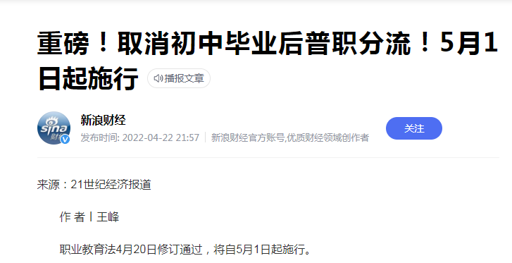 不过2022年中考生迎来了一个好消息:在新职业教育法中,规定到将会取消初中毕业后的普职分流,可以让更多的学生升入到普通高中。