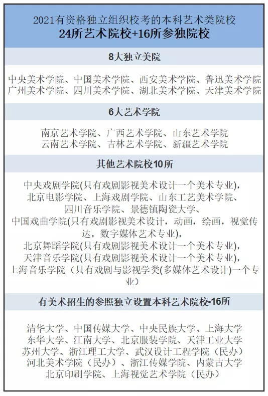 比如国家规定的具有校考资格的30所独立设置艺术本科院校及15所参照独立设置本科艺术院校招生高校