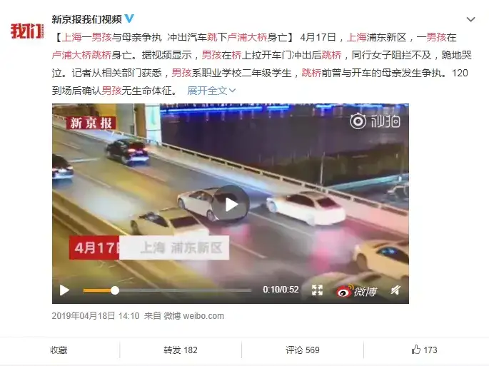 上海卢浦大桥上,一名男孩突然跑下车后迅速跳桥,紧跟着的男孩妈妈因没能抓住他跪地痛哭……