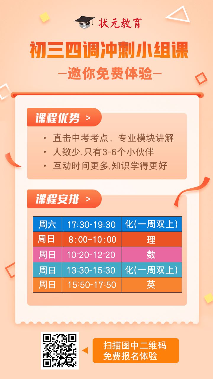 首 先 四调是中考前最后一次的全市规模统考,让孩子能够再次复习一遍中考考场上的所有流程,比如时间的把控,对试卷的检查,做题的先后顺序,等等。 其次 四调考完之后,各个学校会发布四调签约线,元调没有签约的,或者元调没有签上好约的学生,可以凭借四调考试成绩,再次与心仪高中签约或者升约。 再者 四调的题目相对于元调跟中考,稍稍简单一些,主要目的是给孩子树立信心。 为了帮助初三学子打好中考前的最后一战,也为了帮助九年级学员快速突破最后压轴题的难关,状元教育四调冲刺小组课免费体验,名师带你迅速突破四调难点! 3-6人小组课 为初三学生定制冲刺提升计划~