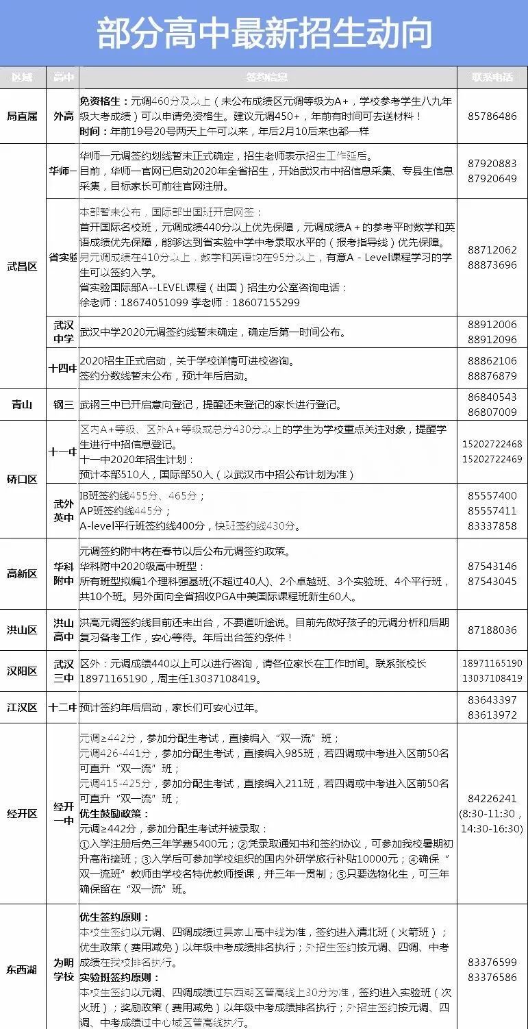 1、中心城区考生 我的国家生病了,我的城市生病了,我正在和我的国家、我的城市一起和疫情抗争。在这场战争中,没有旁观者,我们都是战士,我们和国家命运紧紧联系在一起。 ●湖北省武昌实验学校(国际部)● 国际部出国班(不参加国内高考)网签开始了,很多家长对我们今年的名校班(440分及以上)比较感兴趣,私下提了很多的问题,我将大家比较感兴趣的问题统一回答如下: 签约即录取,签满为止。当然如果名额没满,后面我们会按照新的签约要求继续签约,由于名额会逐步减少必然或导致后面的要求也会越来越高。 2.往届成绩即录取请大家看招生简章。 ●部分高中招生/签约信息汇总●