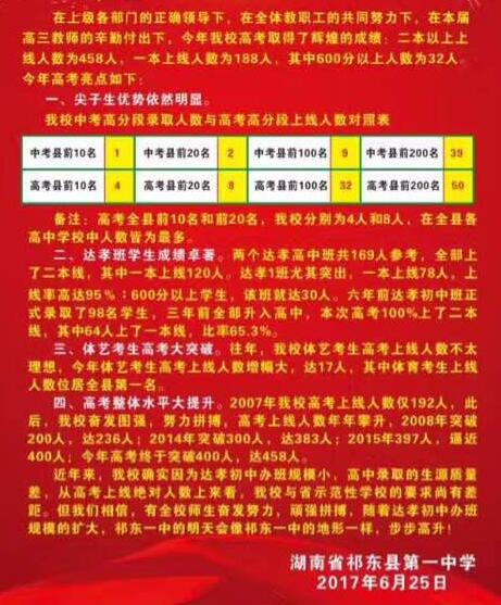 2017年祁东一中高考成绩相比去年有了显著的提升,终于拿回了属于自己的位置,今年高考本二上线458人,本一上线188人,其中600分以上考生人数为32人。今年高考全县前10名祁东一中占4人,全县前20名祁东一中占8人,相 ...