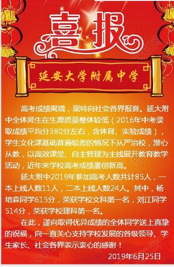 延安大学附中2019高考喜报成绩、一本二本上线人数情况