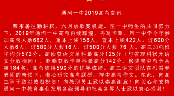 寒来暑往勤耕耘,六月放歌奏凯旋。在一中师生的共同努力下,2019年通河一中高考再续辉煌,再写华章。第一中学今年参加高考人数662人,重本上线156人,普本上线422人。过600分人数6人,过580分人数16人,过500分人数 76 人。高三加强班平均分572分。高硕获语文单科最高分125分(与省理科状元语文分数相同),赵鹏获数学单科最高分142分。柳晓青中考全县第184名,高考取得590分的优异成绩。高三语文团队在冯雪春老师的带领下,潜心研究高考题型,押中高考作文。在此,向高三学子致以热烈祝贺!向教职员工致以崇高谢意!向关心和支持通河一中教育事业发展各级领导和社会各界人士致以衷心感谢!