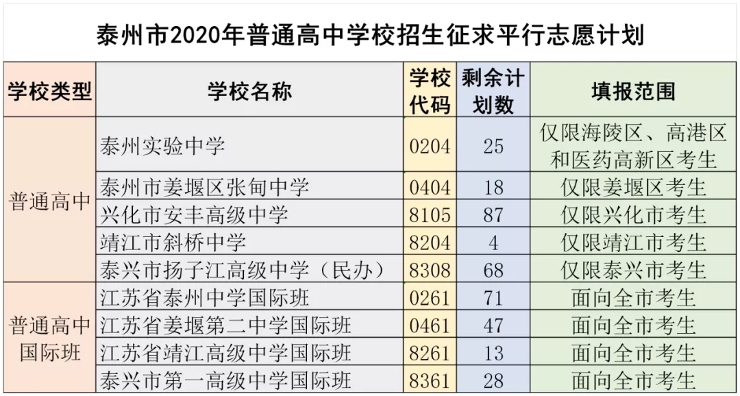 泰州市2020年高中阶段学校招生征求平行志愿时间为7月31日9:00—17:00,确认地点为各市(区)教育局招办(普教科)(市直学校、医药高新区考生确认地点:海陵区教育局普教科)。本次征求平行志愿计划详情如下↓↓↓