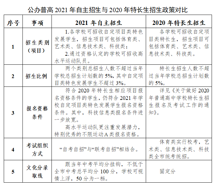 今年出台的《自主招生工作方案》与往年特长生招生政策有什么区别?(一)招生类别增加从往年单一的“特长生招生”转变为多元化的“自主招生”,2021年普高学校自主招生包含两个类别:一是各学校可招收自定项目类特色发展学生;二是通过资格认定的学校可招收高水平运动队队员。(二)招生比例总体不变,项目内有所调整各普高学校2021年自主招收学校自定项目类特色发展学生和高水平运动队队员数量,不得超过学校(建设学校、依托学校)当年总招生计划数的5%,这与往年特长生招生最高比例保持一致。但因2021年招生类别发生变化,各类别比例有所调整:一是学校自定项目类特色发展学生招生数量不超过当年学校总招生计划数的3%,招生项目可包括体育类、艺术类、信息技术类、科技类四大类别,招生项目及招生人数由学校在可招收自定项目类特色发展学生数量内自定。二是通过资格认定的学校,每项目队可招收不超过学校总招生计划数的1%的运动队员,招收项目队数量不得超过5个,学校所有项目的高水平运动队招收队员数量不超过学校当年总招生计划数的5%。(三)报名资格条件放宽符合2020年特长生相应项目报名资格条件的学生,仍符合2021年学校自定项目类特色发展学生报名资格条件。其中,科技信息类报名条件进一步拓宽。高水平运动队队员招收则更注重发展潜力,特别优秀的学生不限运动A类报名资格。(四)考试组织方式赋予学校更多自主权改变往年特长生体育类实行校考,其余类别全市统考统招的方式,2021年自主招生为学校“自考自招”与“联考自招”相结合,学校在自主发展特色上被赋予更大权限。(五)文化分录取线与平均分挂钩往年特长生招生文化分录取线为固定分数线,今年自主招生文化分录取线则跟当年中考平均分挂钩,不低于全市中考总平均分100分,学校可视情上浮,50分为一档。4大类自定项目包括哪些招生子项目?体育类包括篮球、足球、排球、健美操、乒乓球、羽毛球、武术、游泳、田径及经批准的其它项目;艺术类包括美术、声乐、器乐、舞蹈;信息技术类不细分具体招生子项目;科技类包括科技创新、电脑机器人、航空航天模型。什么是高水平运动队?建设高水平运动队有哪些依据?学校如何进行招收资格认定?高水平运动队是指具备条件的普通高中学校,按照相关规定,通过招收具有较高水平的运动员学生,在文化学习之余开展专业运动训练、进一步提高运动项目竞技水平而组建的学生运动员代表队的统称。普通高中阶段学校建设高水平运动队的主要目的是引导学校多元化、特色化办学,发展素质教育,帮助学生在锻炼中享受乐趣、增强体质、健全人格、锤炼意志;健全学校体育课余训练和竞赛工作机制,为有体育特长的学生提供平台和条件,为高等学校和各级运动队输送全面发展的体育后备人才,完成广东省学生运动会及系列中学生比赛任务,推进我市学校体育健康生态发展格局建设、助力健康广东行动。我市推动普通高中“高水平运动队”建设,其政策依据: 2020年10月,中共中央办公厅、国务院办公厅《关于全面加强和改进新时代学校体育工作的意见》提出:加强体育传统特色学校建设,完善竞赛、师资培训等工作,支持建立高水平运动队,提高体育传统特色学校运动水平。此外,《广东省人民政府办公厅关于强化学校体育促进学生身心健康全面发展的意见》(粤府发〔2016〕119号)提出:探索教体融合在高中阶段学校培养高水平运动员的模式,推动普通高中学校体育工作全面发展。我市将按照突出重点、发挥优势、利于竞赛、动态调整的原则,统筹规划全市普通高中高水平运动项目布局。高水平运动队招生项目共12项。每间学校原则上不超过5个项目。普通高中高水平运动队建设以三年为一个周期,由学校申报,经市教育局综合评审后进行认定。考生须符合哪些资格条件才能报名参加东莞市公办普通高中2021年自主招生?详见《东莞市公办普通高中学校2021年自主招生工作方案》附件《2021年高中自主招生类别及报名资格条件表》,其中 “中考总分”、“综合素质评价等级”为录取限制条件。各招生学校可以以全市最低报名条件作为本校自定项目类的报名条件,也可以在最低报名条件基础上,自行提高专业要求、中考总分、综合素质评价等级作为正式报名和录取的条件。各招生学校不得自行降低报名和录取条件,不得修改报名及录取的户籍限制条件。高水平运动队员招生和录取条件全市统一,学校不能修改。考生能否同时报考多所学校多个项目?不能。考生在同一时段只能报考一所学校的一个项目。但按时间安排,高水平运动队报名考试在前,如考生报考高水平运动队未被录取,未被录取的学生可再报考学校自定项目特色发展类(限一所学校的一个项目)。东莞市公办普高2021年自主招生考试如何组织?(一)学校自定项目类招生学校自行制定报名、考试和招生办法,并报市中招办核准,招生学校按要求自行组织本校各招生项目的专业考试工作,有相同招生科目的学校,推荐多校联考,根据联考成绩录取;招生学校也可以自行单独组织考试,根据考试、考核成绩录取。(二)高水平运动队队员各项目运动队招生学校要制定内容详细、规范明确的报名、考试和招生办法,经市教育局中招办审定后,向社会公布,并组织校考和联考。各高中阶段学校预