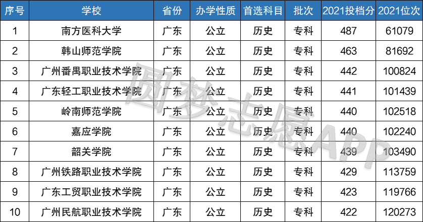 根据广东省教育考试院公布的2021年招录信息,小编为大家整理了广东录取分数线排名靠前的前十所专科院校,这几所专科院校收分都较低,非常适合在本科线徘徊的考生报考。