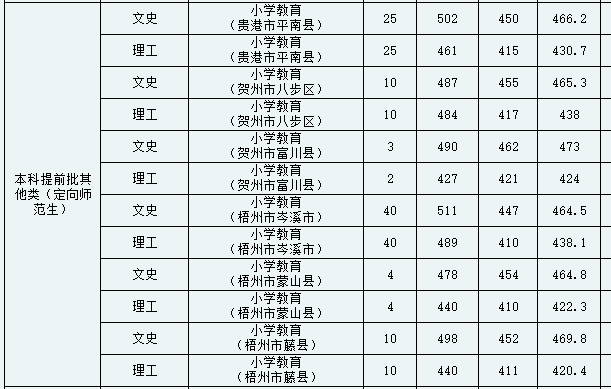 2021年贺州学院地方公费师范生录取最低分文科为478分、理科为427分,各地区定向师范生录取分数线详情如下:
