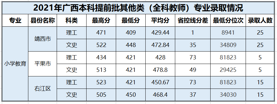 2021年南宁师范大学在广西招收公费师范生最低分文科为451分、文科为482分,各专业录取分数线详情如下: