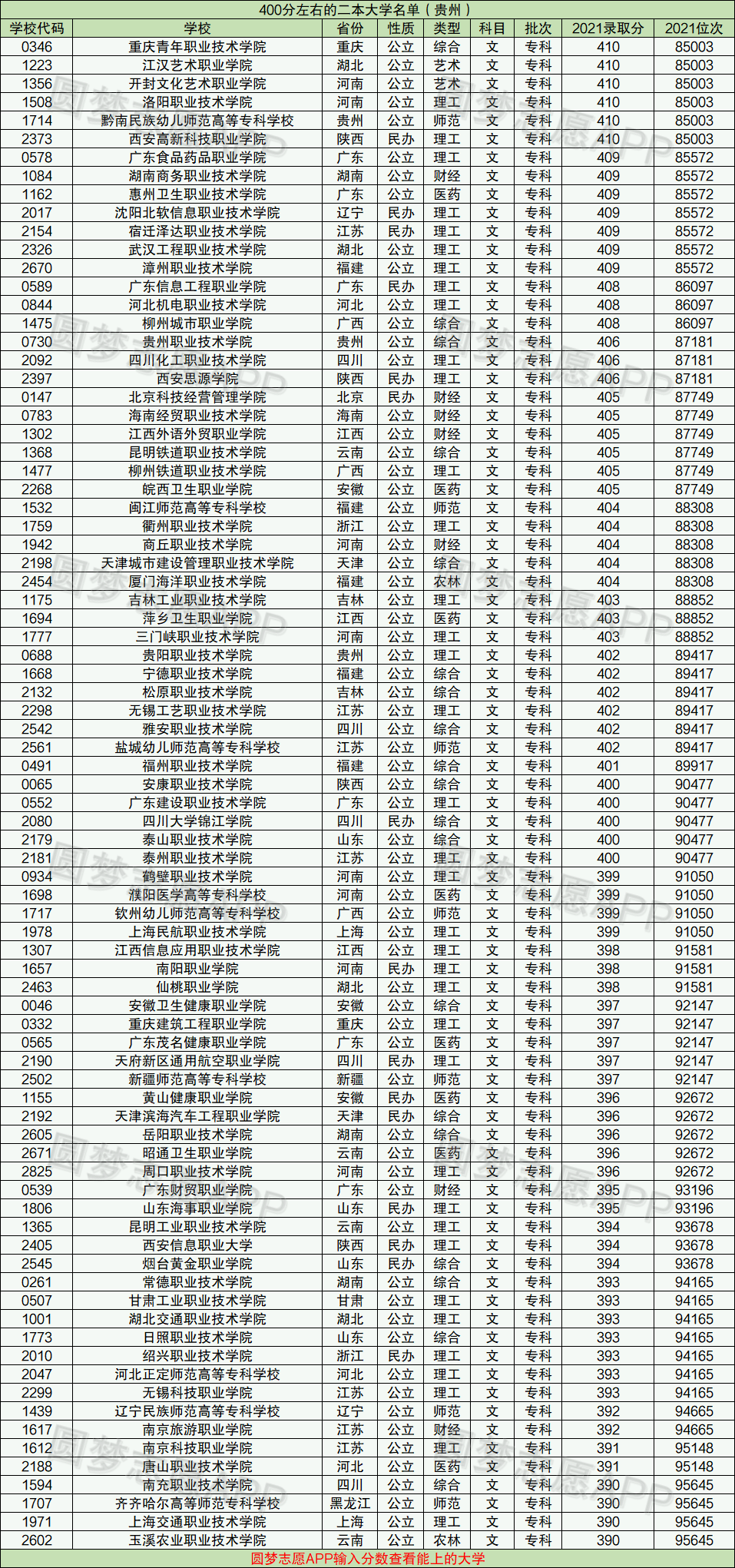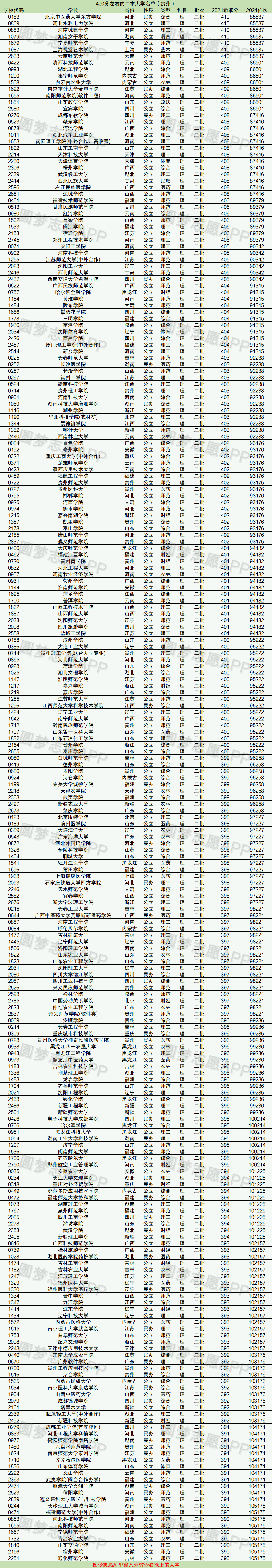 根据提供的招录数据,本文以贵州为例整理了一下2021年在该省最低录取分为400分左右(390-410)的二本大学名单供大家参考,具体如下: