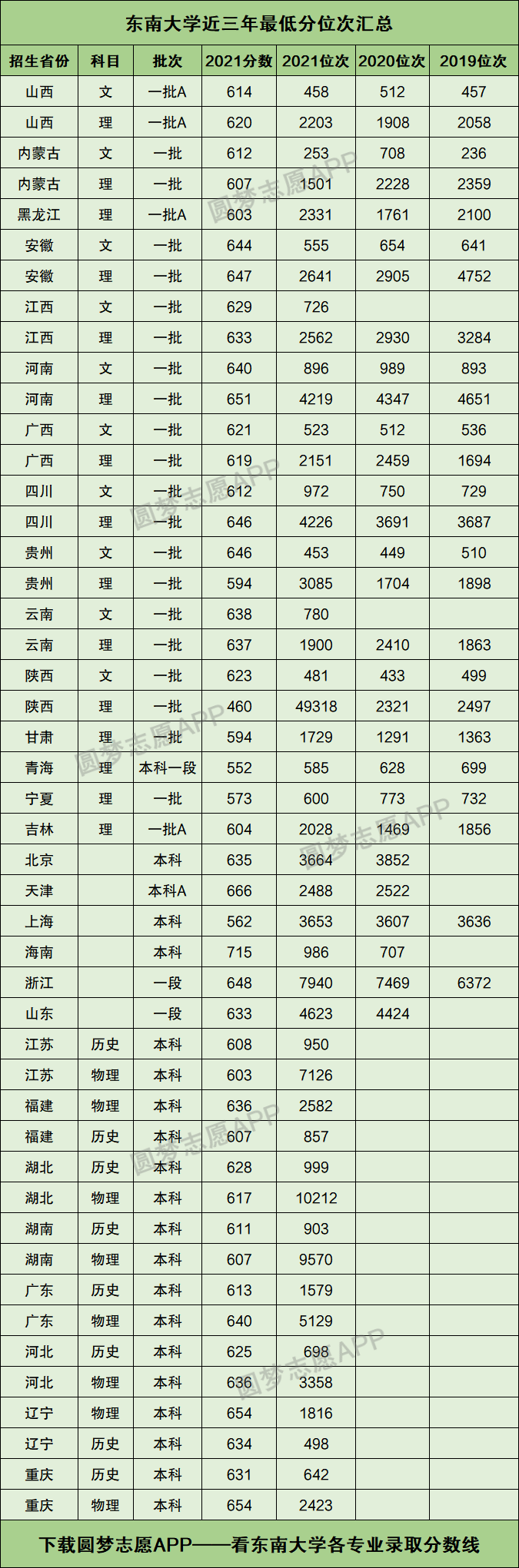 下图为东南大学在全国各个省市2019年~2021年的最低分位次表数据,供参考↓