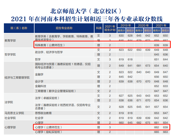 2021年北京师范大学只在安徽理科有公费师范生招生,招生专业有特殊教育和心理学,录取最低分分别为637分和638分。