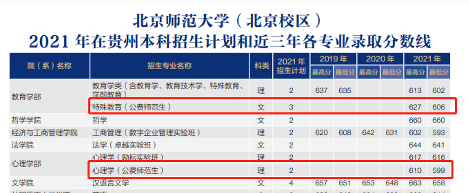 2021年北京师范大学的公费师范生在贵州理科最低录取分数线为599分,在文科最低录取分数线为606分。