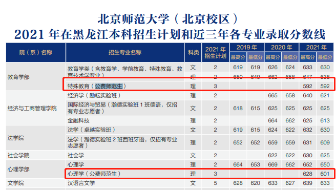 北京师范大学公费师范生2021年在黑龙江理科最低录取分为592分(特殊教育专业),在黑龙江文科未招收公费师范生。