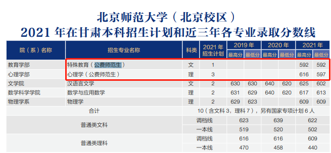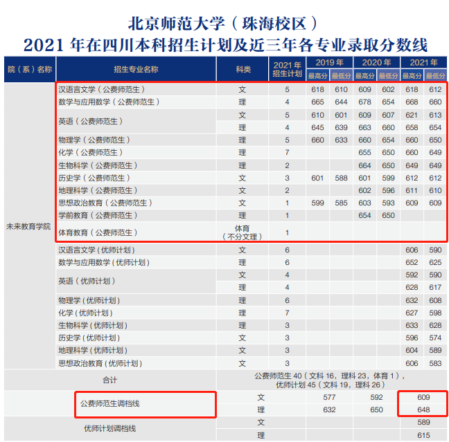 2021年北京师范大学公费师范生在四川省调档线:理科为648分、文科为609分。各专业录取分详情: