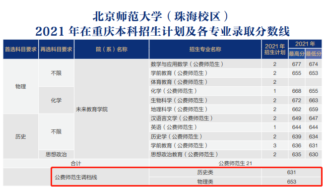 2021年北京师范大学公费师范生在重庆调档线:历史类最低631分、物理类最低653分。各专业录取最高分和最低分详情: