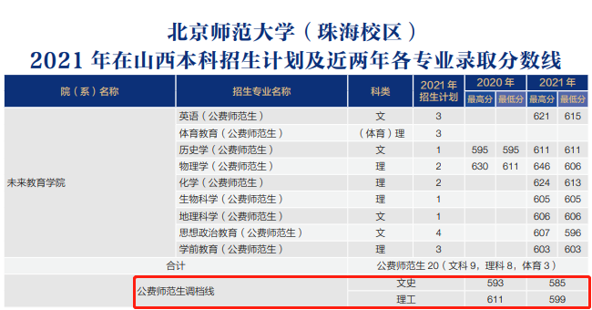2021年公费师范生调档线:文科586分、理科599分。各专业录取分详情: