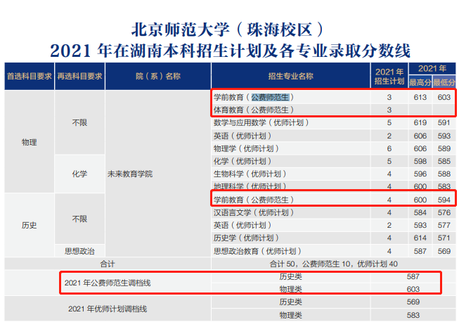 2021年公费师范生调档线:历史类587分、物理类603分。各专业录取分: