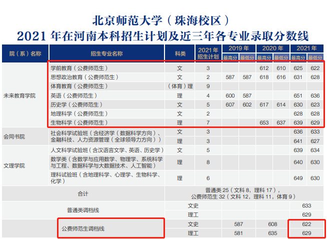 北京师范大学公费师范生2021年河南最低分:文科622分(学前教育专业)、理科629分(生物科学专业),这两个专业均在珠海校区就读。北京师范大学各专业录取分2021: