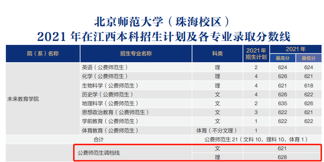 北京师范大学公费师范生2021年在江西调档线:文科621分、理科628分。公费师范生各专业录取分详情: