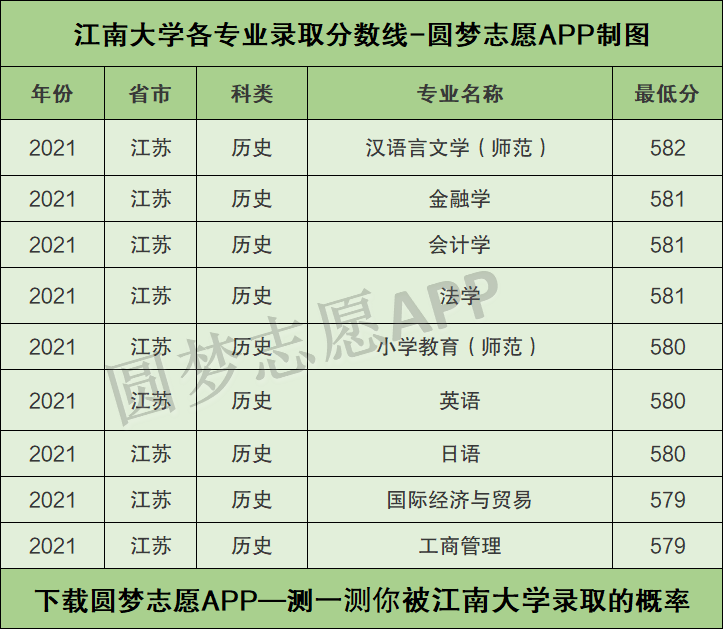 综上可知,江南大学2021年在江苏省历史类普通招生时,录取分数线最低的专业为:国际经济与贸易、工商管理。其对应的最低分为579分。