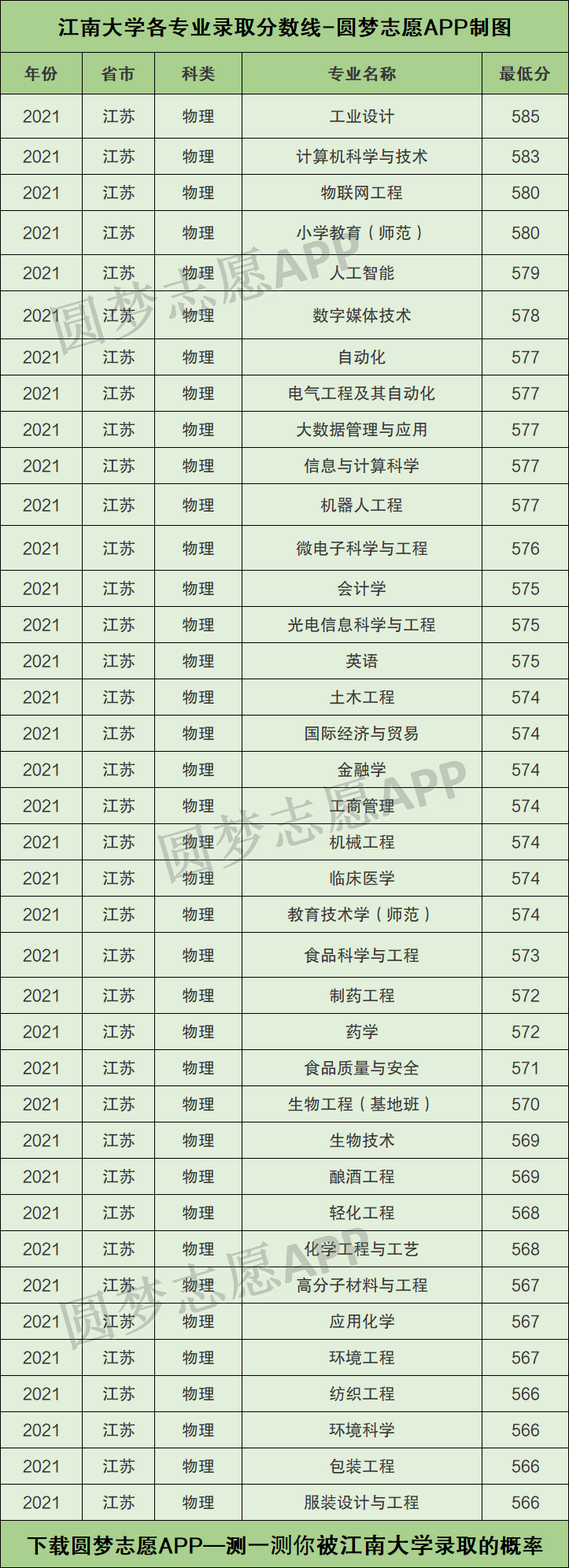 综上可知,江南大学2021年在江苏省物理类普通招生时,收分最低的专业为:纺织工程、环境科学、包装工程、服装设计与工程,其对应的最低分为566分。