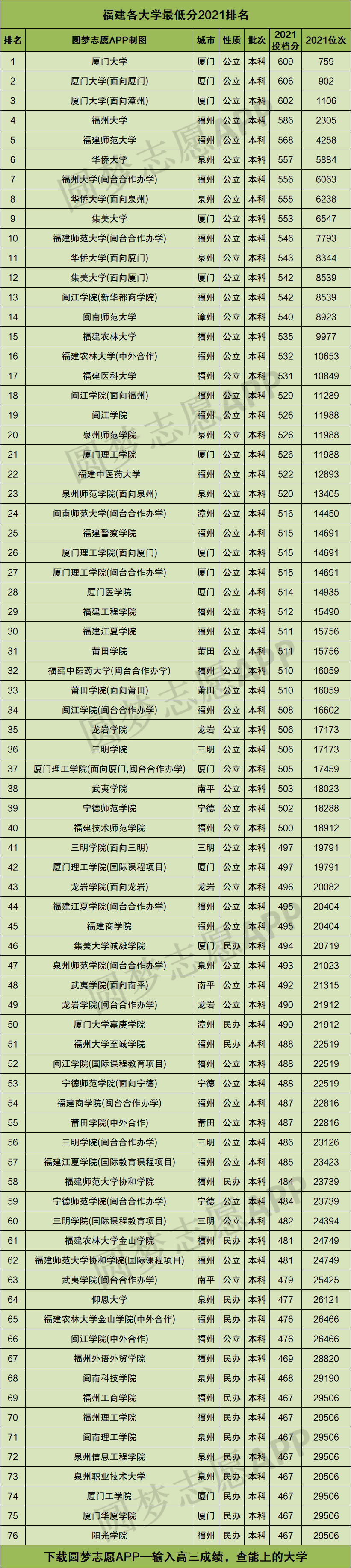 福建所有大学排名和录取分数线,这份资料对于2022年即将面临高考志愿填报的同学来说,非常重要。本文将以2021年各学校历史类最低分为标准进行排序,为大家奉上历史类版本的福建本科大学排行榜一览表。