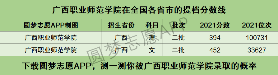 广西职业师范学院在本科二批的最低提档线为394分,最低位次为100731名。