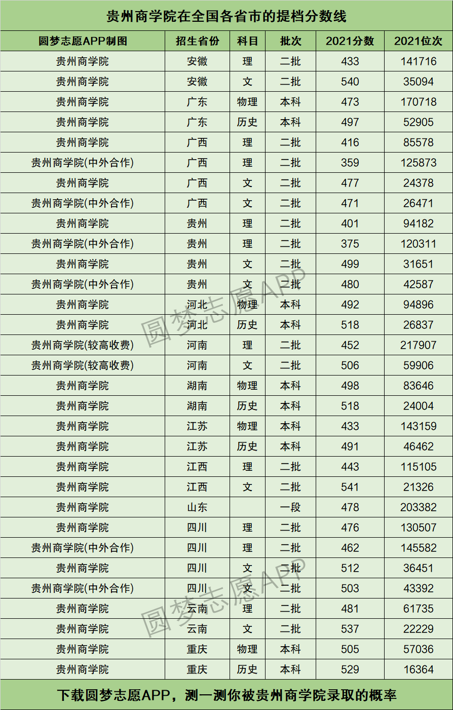 二、贵州商学院在全国各省市的提档线汇总