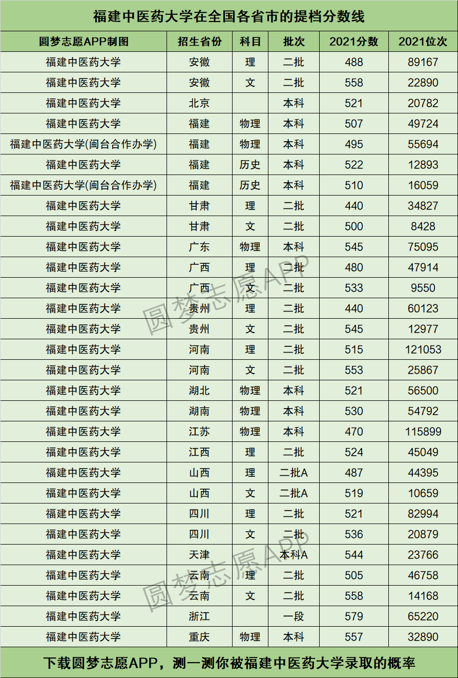 福建中医药大学2021年的提档分数线是多少?福建中医药大学的调档比例是多少?本文将为大家奉上这些重要信息,希望2022年的高考生了解福建中医药大学在全国各省市的最低分数线及位次后,都能被福建中医药大学给成功录取。