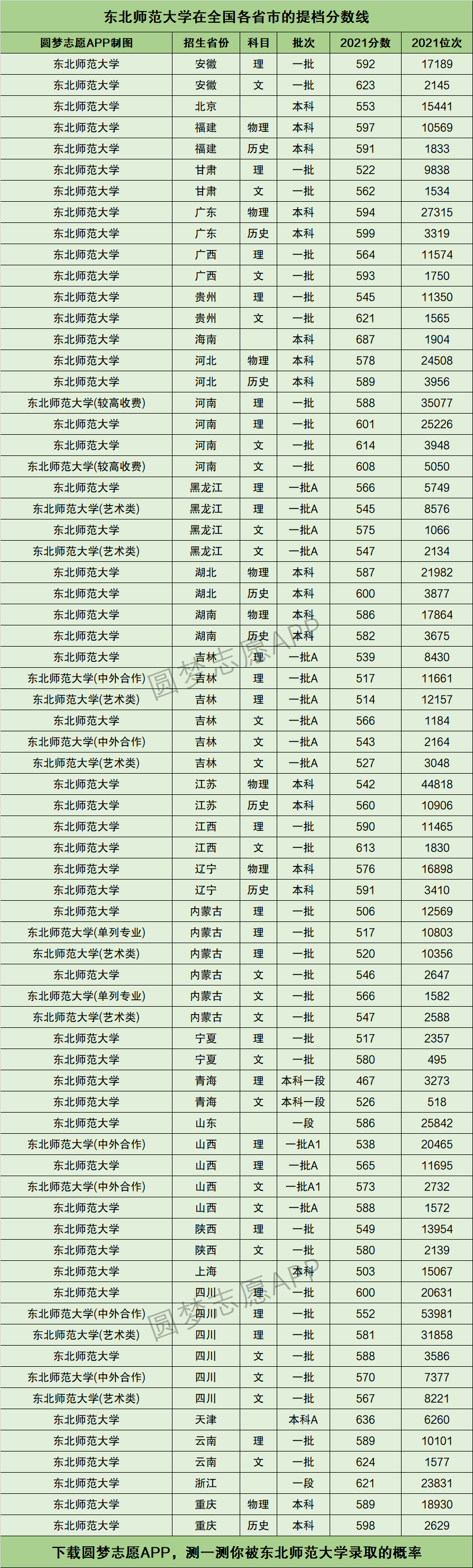 东北师范大学2021年的提档分数线是多少?东北师范大学的调档比例是多少?本文将为大家奉上这些重要信息,希望2022年的高考生了解东北师范大学在全国各省市的最低分数线及位次后,都能被东北师范大学给成功录取。