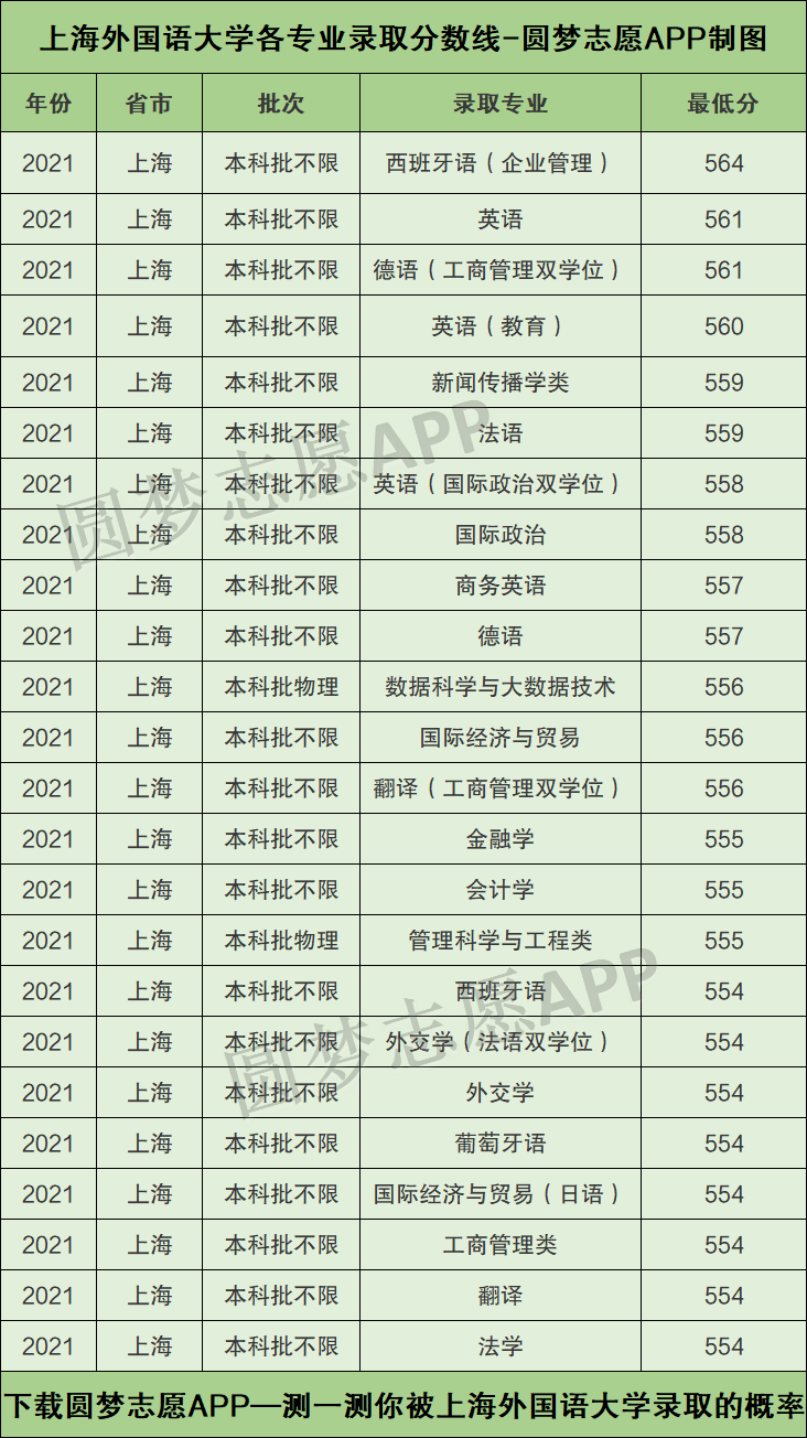 上海外国语大学各专业录取分数线2021年是多少分?