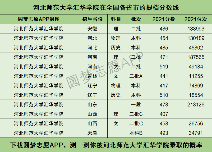 河北师范大学汇华学院2021年的提档分数线是多少?河北师范大学汇华学院的调档比例是多少?本文将为大家奉上这些重要信息,希望2022年的高考生了解河北师范大学汇华学院在全国各省市的最低分数线及位次后,都能被河北师范大学汇华学院给成功录取。