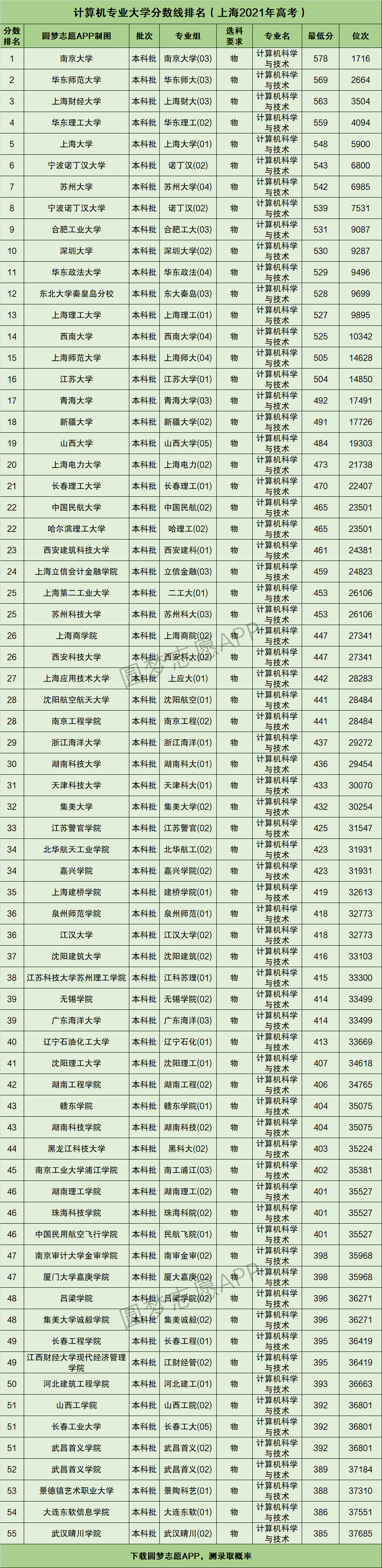 以上这10所大学的计算机专业2021年在上海市招生时,录取分数线排名前十具体收分范围为529分至578分。