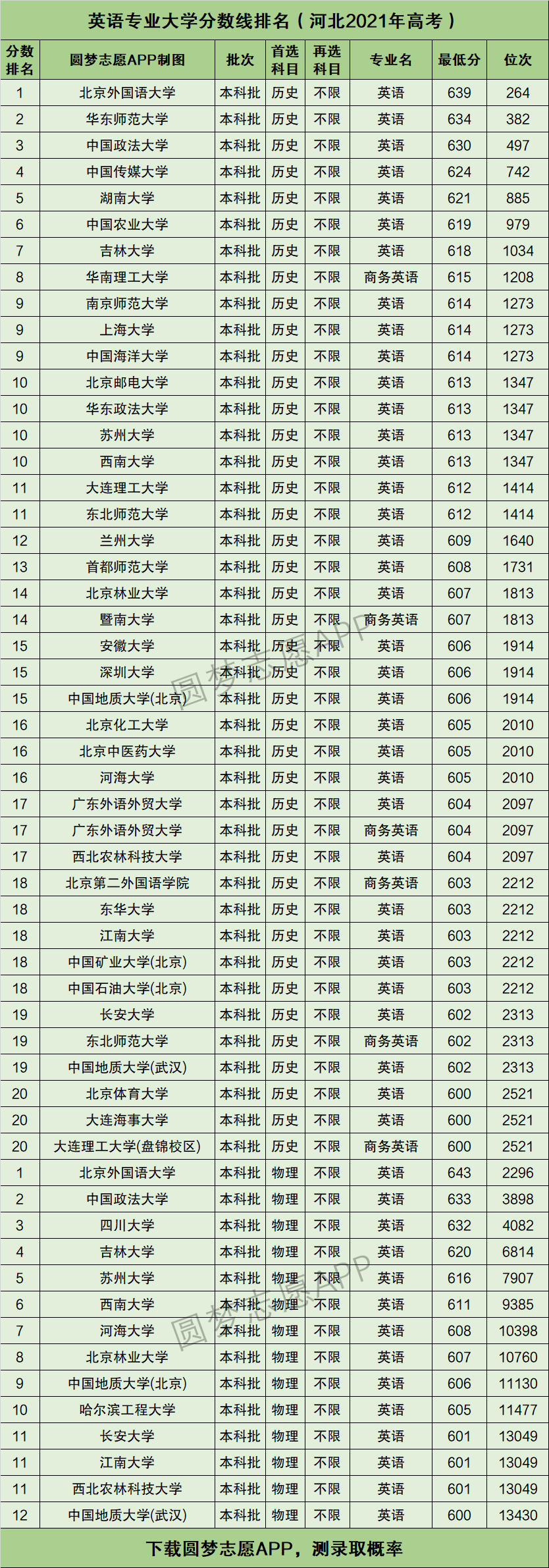 以上这10所大学的英语专业2021年在河北省招生时,历史类录取分数线排名前十具体收分范围为614分至639分。