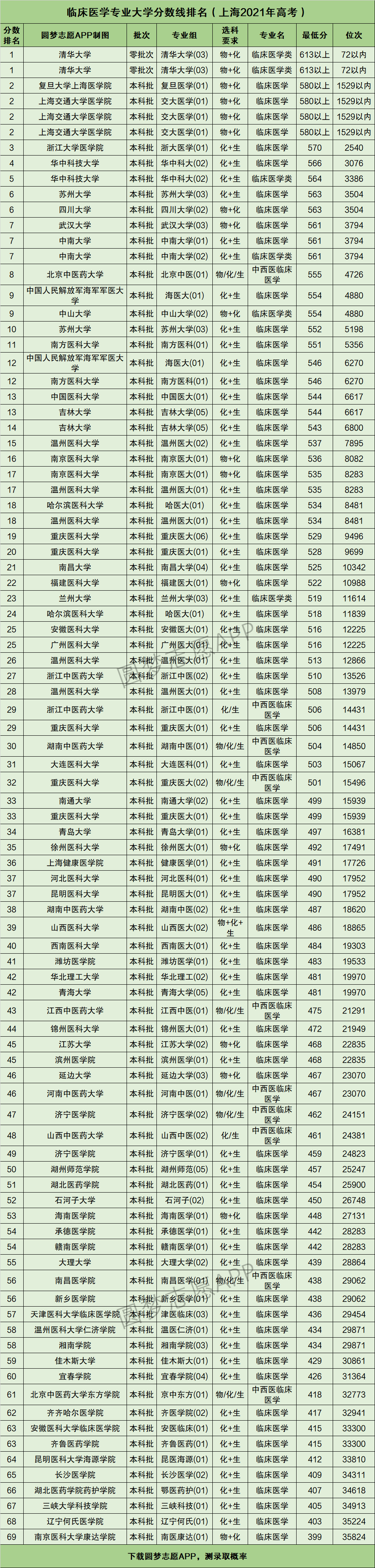 “临床医学专业全国大学排名、及其在上海市2021年的最低录取分数线”这份名单,对2022年上海市内想读临床医学专业的高考生来说,帮助巨大。