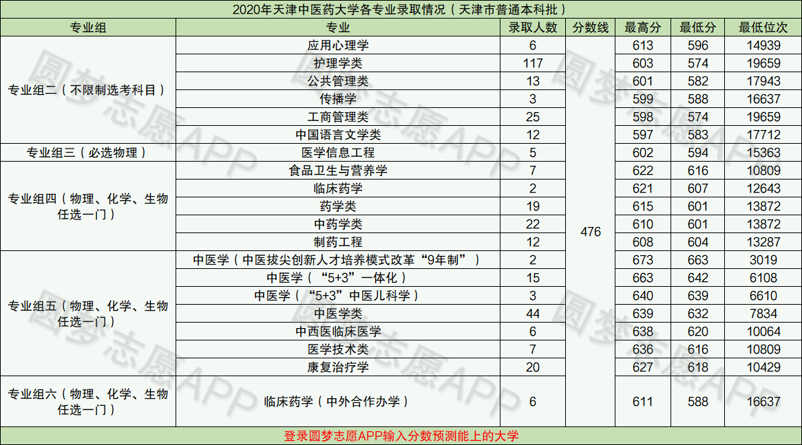 由于目前学校官网暂未公布2021年的录取数据,因此小编整理的是2020年天津中医药大学各专业在天津本地的录取分数线表。
