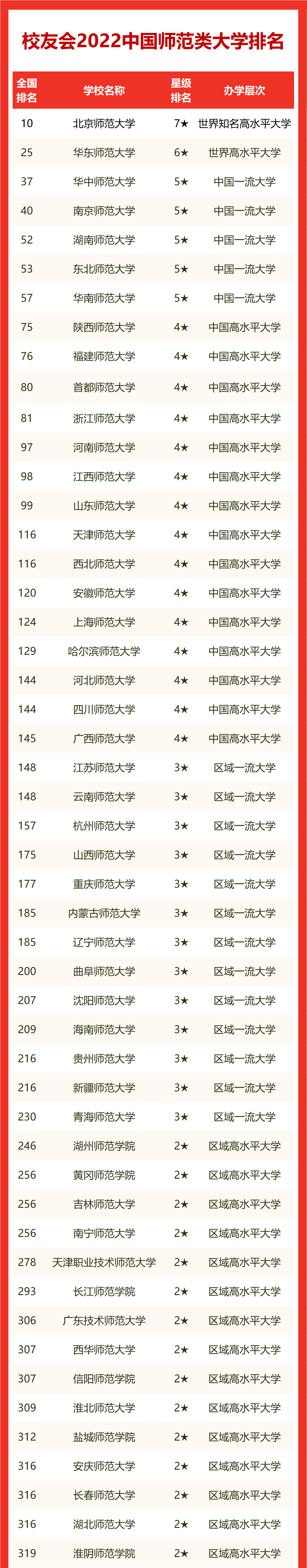 根据校友会2022年全国师范大学排名可知,全国排名前十的师范大学分别如下: