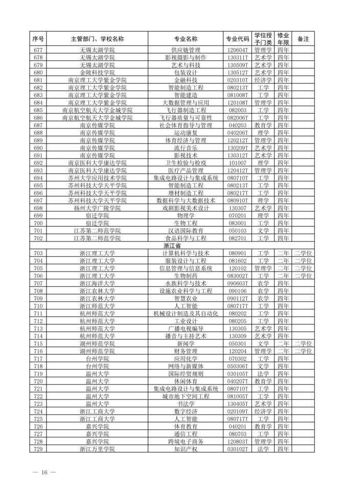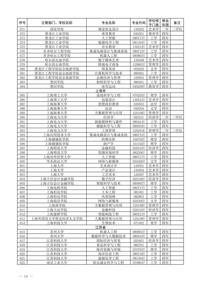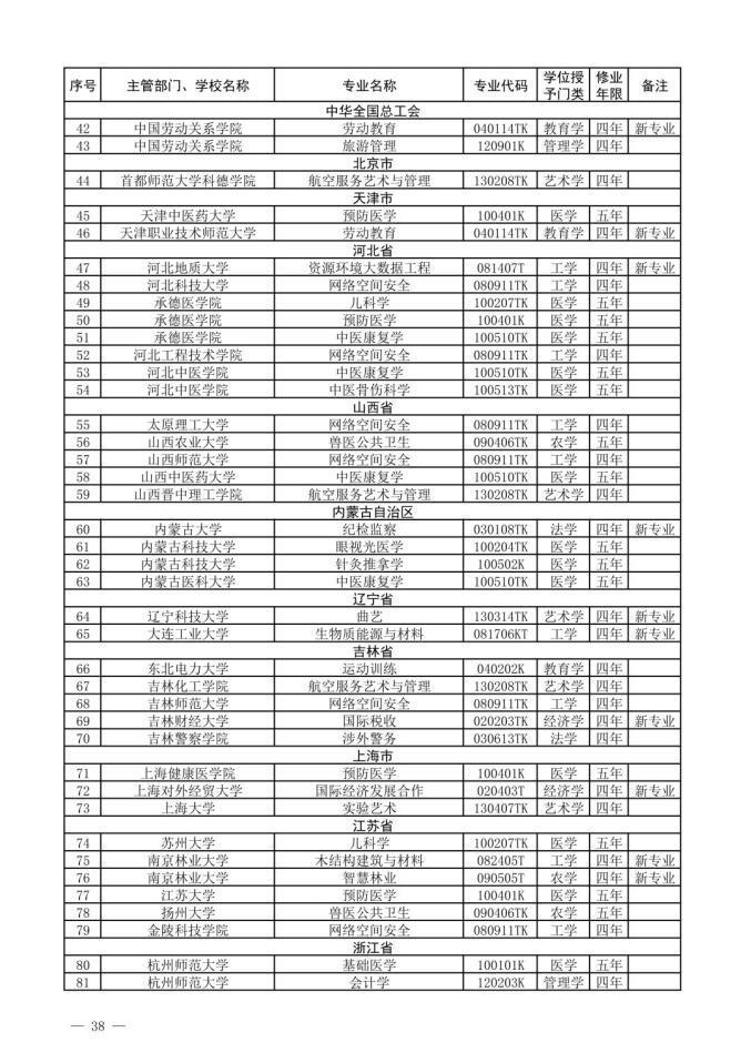 此外被教育部列入普通高等学校本科专业目录的新专业名单一共有31个,包含了经济学、法学、教育学、历史学、工学、农学、管理学等9个学科门类。