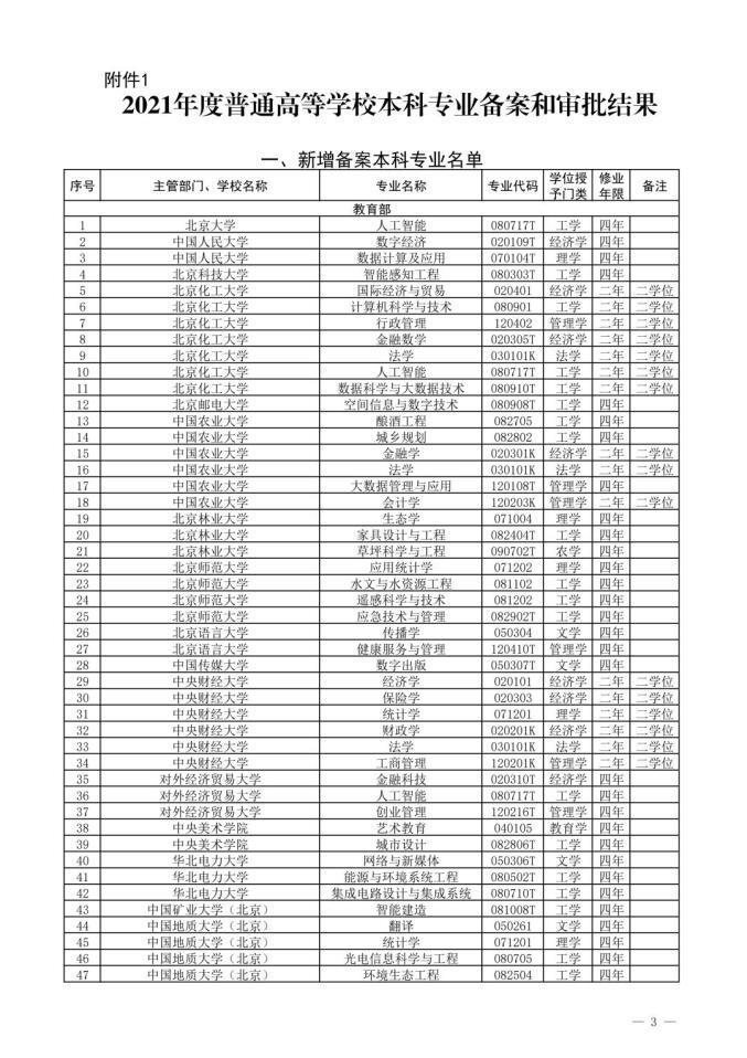 根据教育部发布的《教育部关于公布2021年度普通高等学校本科专业备案和审批结果的通知》: