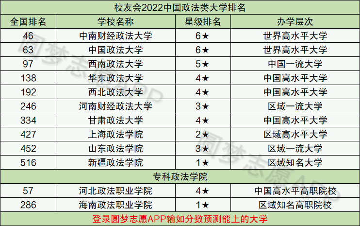 从校友会排名来看,排名前五的政法大学分别是中南财经政法大学、中国政法大学、西南政法大学、华东政法大学、西北政法大学;其中前两所是211高校,后面3所为双非(非985、211),这五所政法大学也是就是法学界“五院四系”的五院,在业内的认可度极高。另外有两所政法职业学院上榜政法类排名,分别是河北政法职业学院和海南政法职业学院。