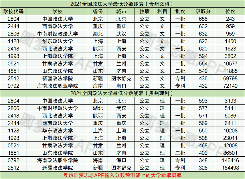 下面是2021年全国政法大学在贵州省的最低录取分数线表: