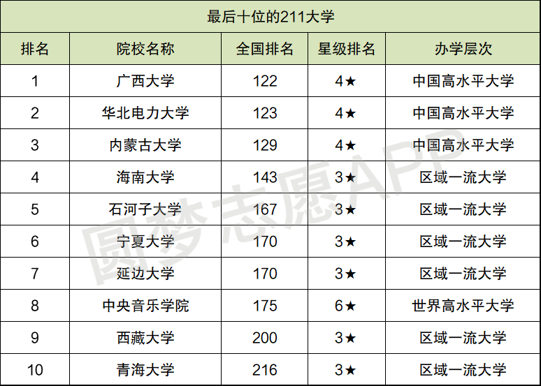 在排名最后十位的985大学中只有西藏大学和青海大学在全国200名之后,其余院校都在200名以内,只是从海南大学开始,排名之间的名次差距越来越大。