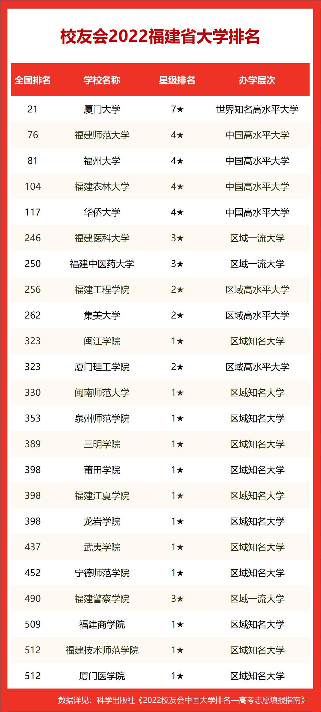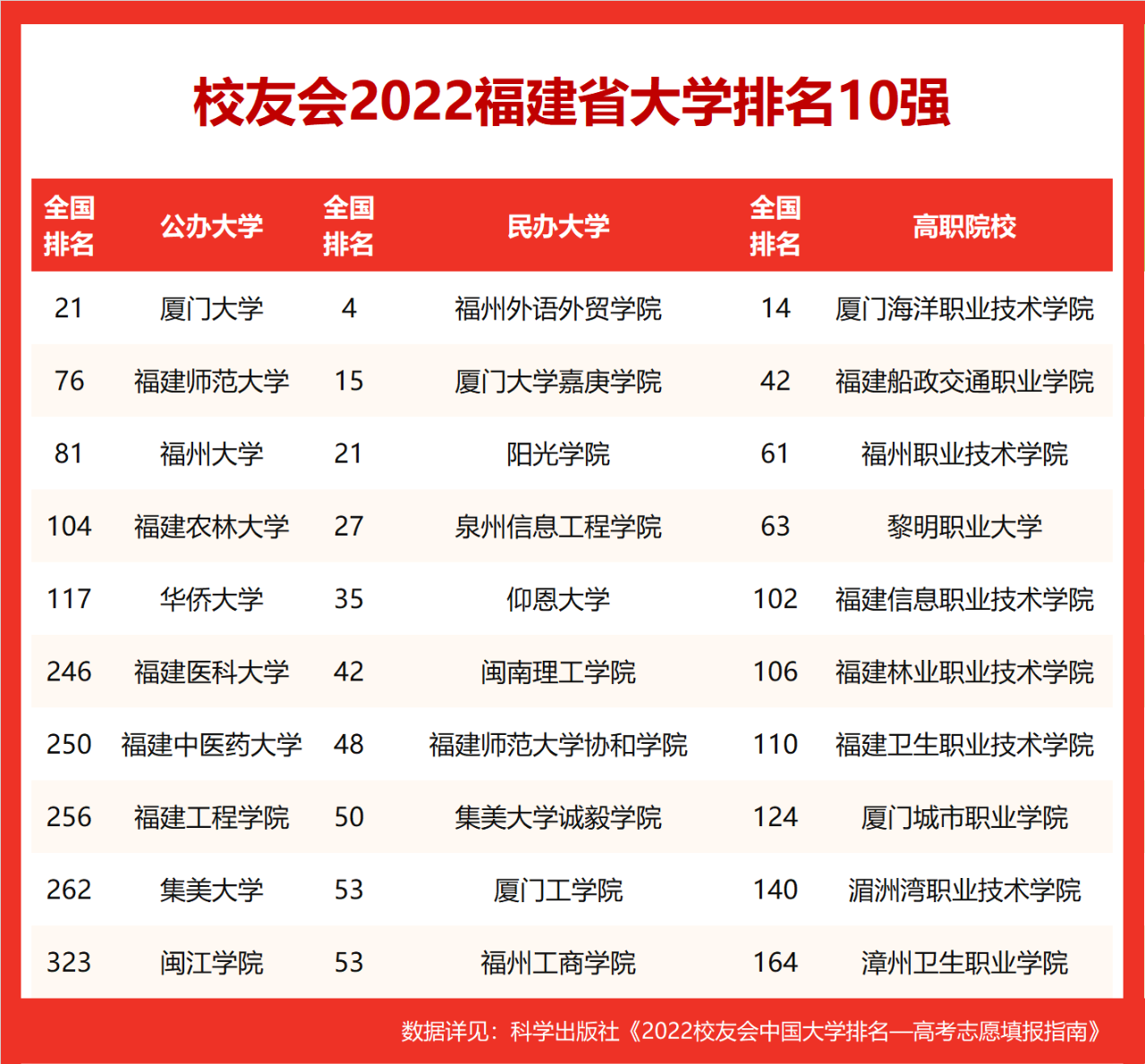 在最新2022校友会中国大学排名中,厦门大学全国排名第21,雄居2022福建省大学排名第一。福建师范大学(第76名)居第2,福州大学(第81名)列第3,名列前10强的其他高校为福建农林大学(第104名)、华侨大学(第117名)、福建医科大学(第246名)、福建中医药大学(第250名)、福建工程学院(第256名)、集美大学(第262名)、闽江学院(第323名)。