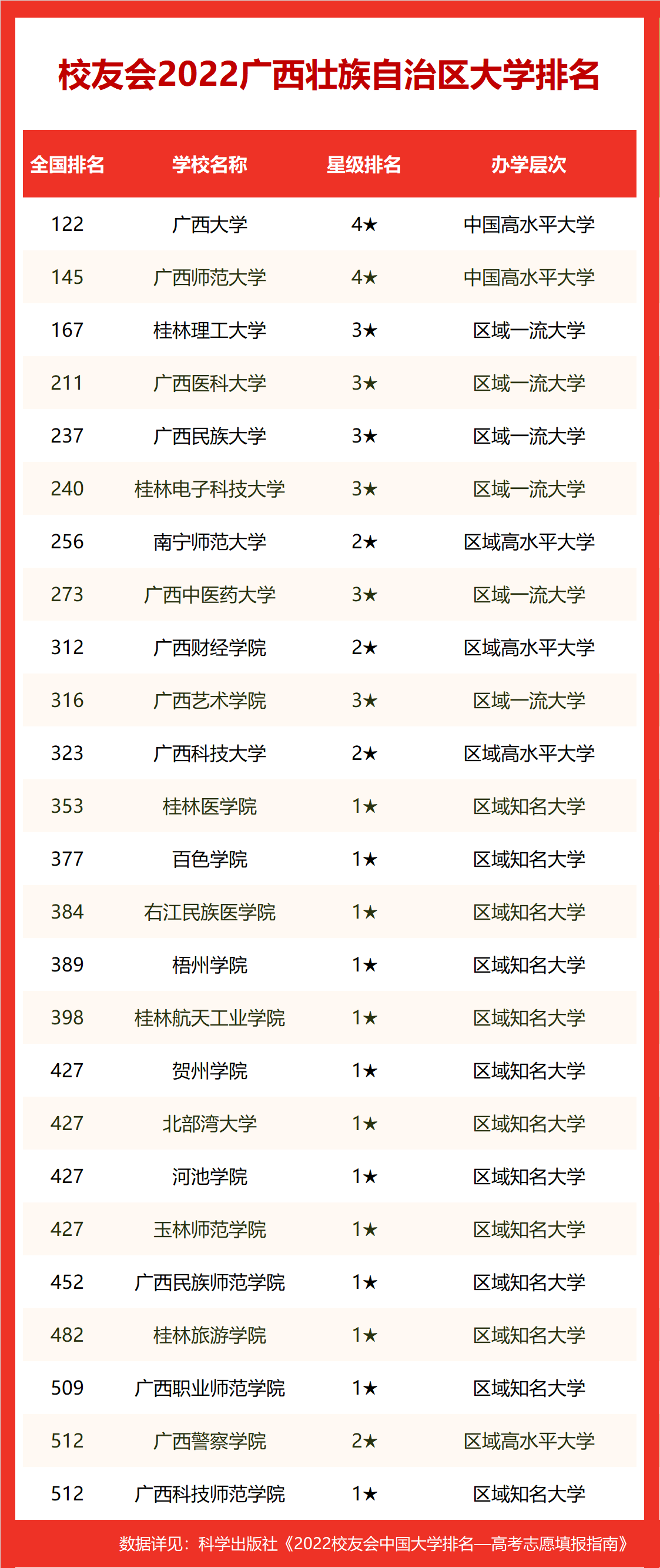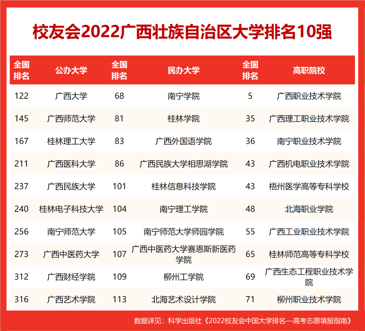 在最新2022校友会中国大学排名中,广西大学全国排名第122名,雄居2022广西壮族自治区大学排名第一。广西师范大学(第145名)居第2,桂林理工大学(第167名)列第3,名列前10强的其他高校为广西医科大学(第211名)、广西民族大学(第237名)、桂林电子科技大学(第240名)、南宁师范大学(第256名)、广西中医药大学(第273名)、广西财经学院(第312名)、广西艺术学院(第316名)。