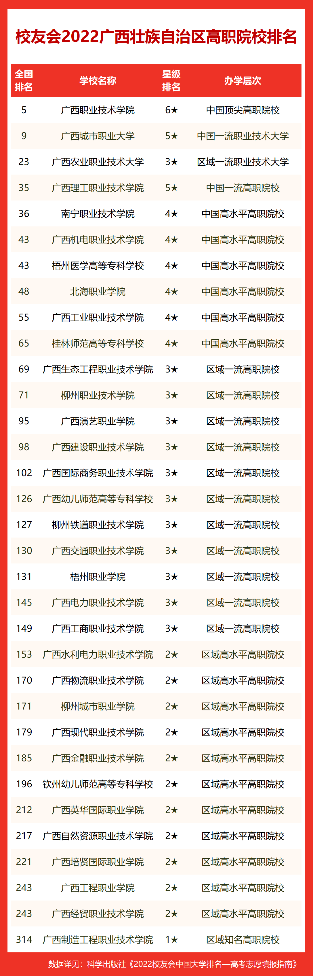 在2022校友会中国高职院校排名中,广西职业技术学院全国排名第5名,雄居2022广西壮族自治区高职院校排名第一。广西理工职业技术学院(第35名)列第2,南宁职业技术学院(第36名)居第3。名列前10强的其他高职院校为广西机电职业技术学院(第43名)、梧州医学高等专科学校(第43名)、北海职业学院(第48名)、广西工业职业技术学院(第55名)、桂林师范高等专科学校(第65名)、广西生态工程职业技术学院(第69名)、柳州职业技术学院(第71名)。