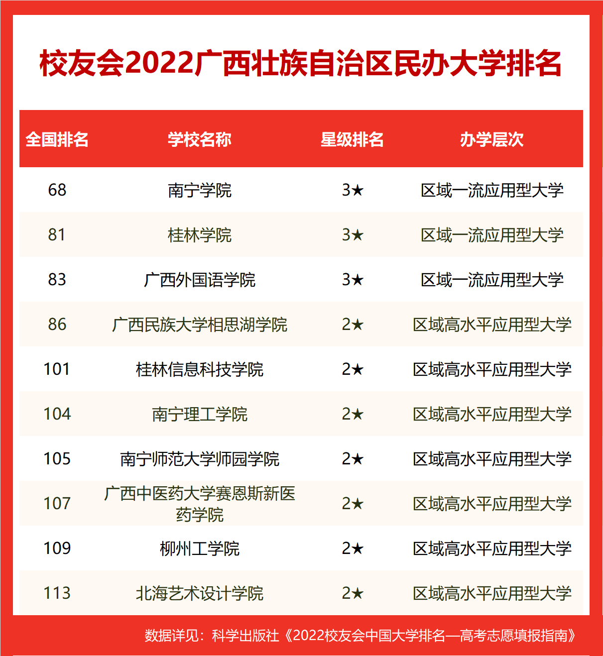 南宁学院雄居2022广西壮族自治区民办大学排名冠军,柳州工学院跻身前10强