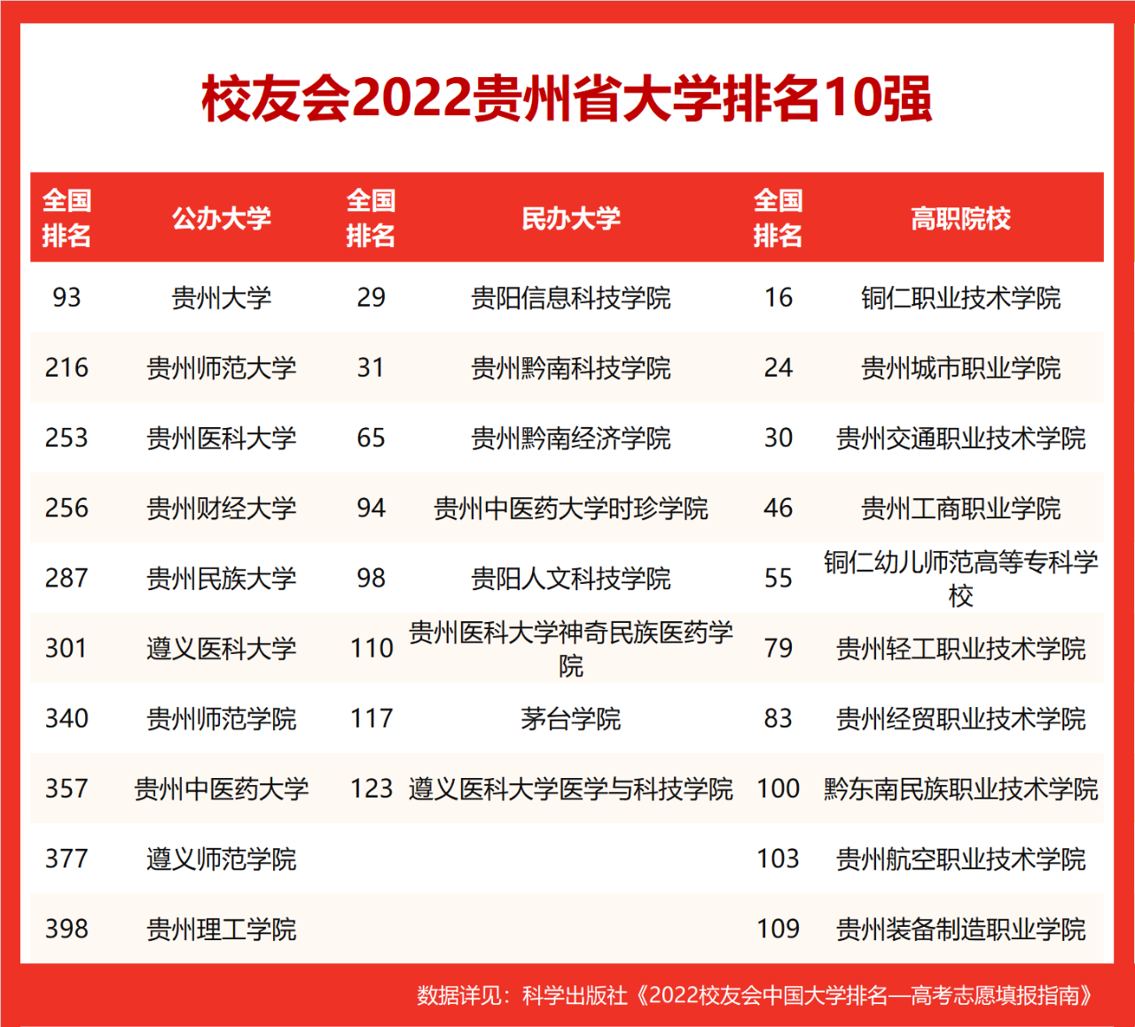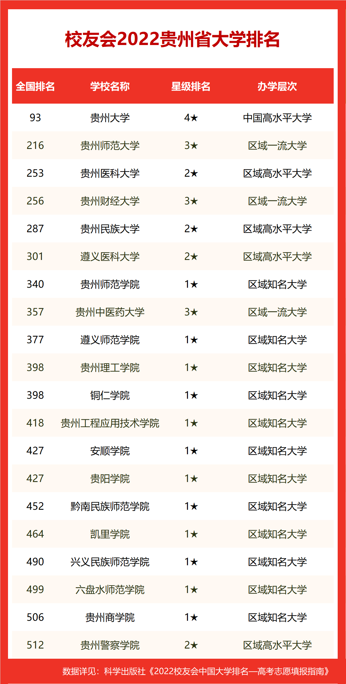 在最新2022校友会中国大学排名中,贵州大学全国排名第93,雄居2022贵州省大学排名第一。贵州师范大学(第216名)居第2,贵州医科大学(第253名)列第3,名列前10强的其他高校为贵州财经大学(第256名)、贵州民族大学(第287名)、遵义医科大学(第301名)、贵州师范学院(第340名)、贵州中医药大学(第357名)、遵义师范学院(第377名)、贵州理工学院(第398名)。