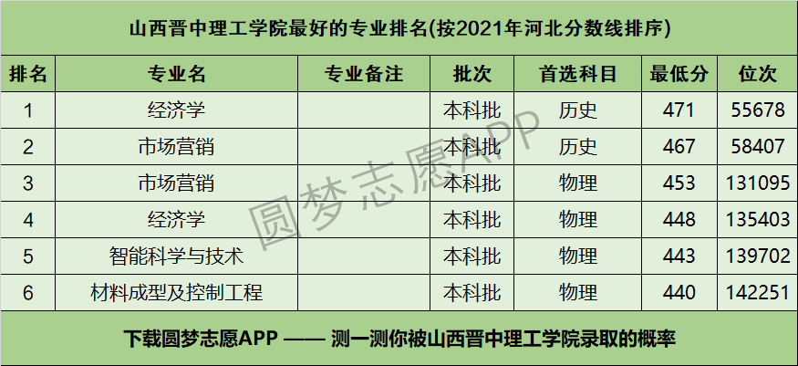 由于山西招生考试网目前还未公布2021年的专业分,所以本文将以山西晋中理工学院在河北2021年高考的录取情况为例,为大家展示山西晋中理工学院最好的专业排名。